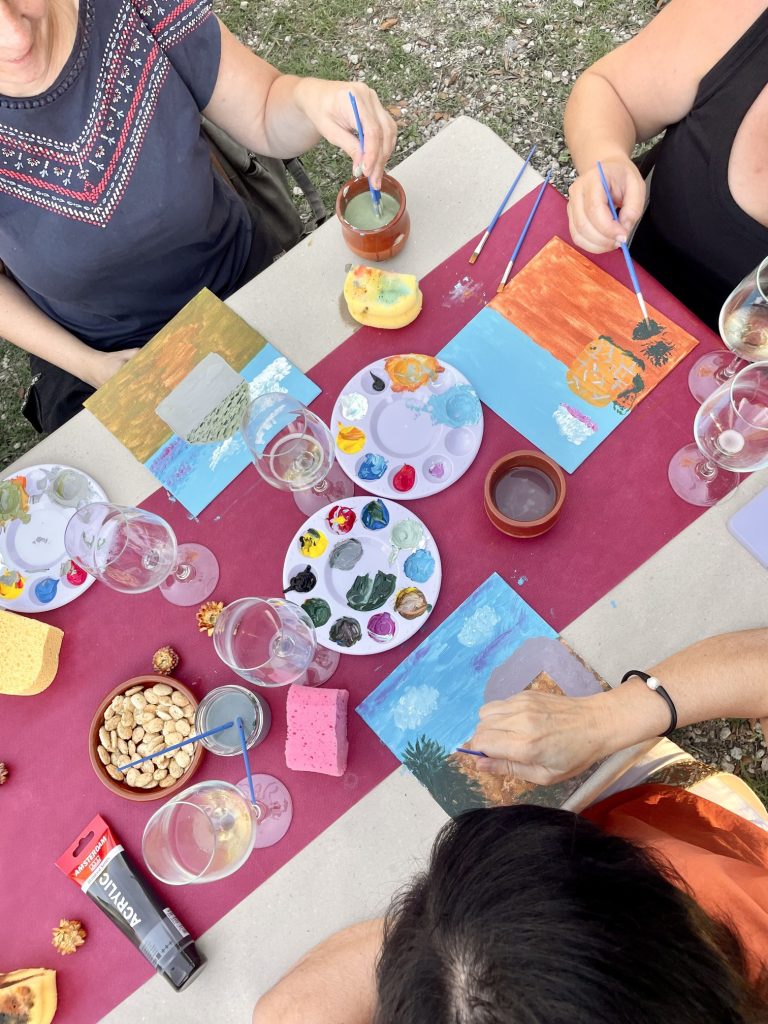 Una artista local en fa el guiatge i exposa algunes nocions bàsiques de pintura. Cada creació va acompanyada d’uns vins expressament seleccionats per maridar amb el significat i els colors del quadre, creant així una experiència completa que busca la unió entre art i gastronomia.